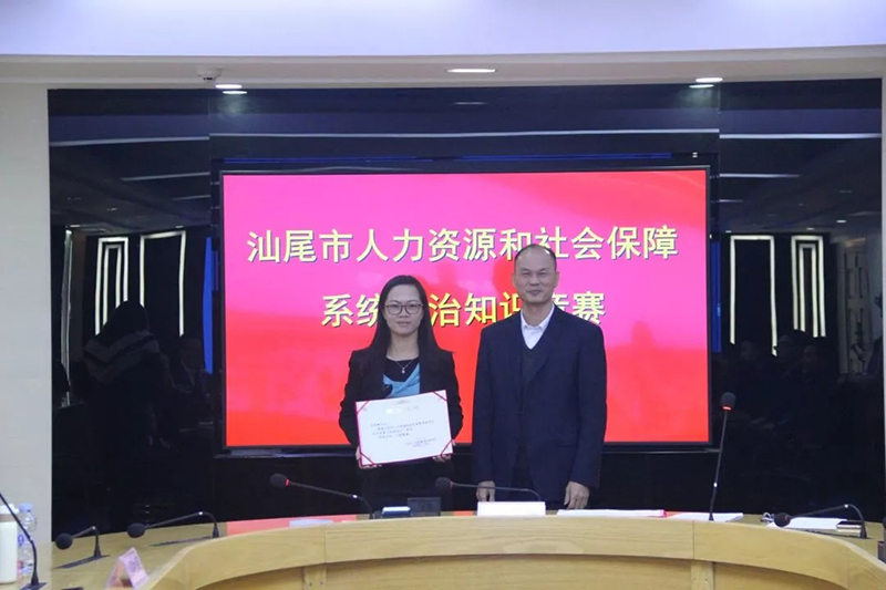 1月8日下午,汕尾市人力资源和社会保障法治知识竞赛在汕尾市人社局成功举办,来自市级、各县(市区)的七支参赛队共派出了近20名选手参赛,我校郑雪敏老师代表陆丰市人力资源和社会保障局参加了本次竞赛并获得了“优秀选手”奖。